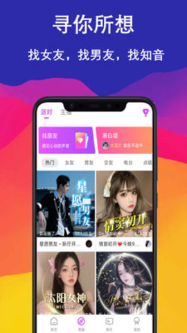 大量优质网友,您专属的热玩在线派对,用语音魅力展现自我,找出您喜爱的语音,与高价值主播在线群CP进行交流。