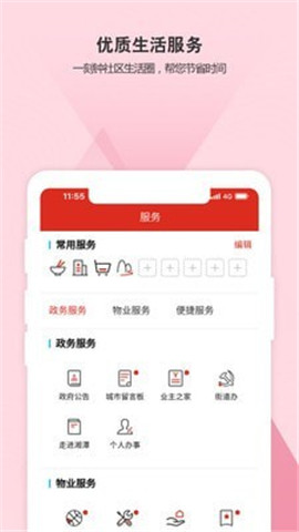 为用户提供了各种优质的功能,包含了物业服务、社区底商、臻品电商、邻里社交、便利服务等服务。