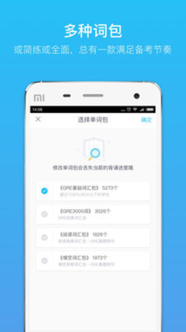 涵盖GRE高频词汇,不止GRE3000词哦,为处在GRE考试不同学习阶段和进度的学员提供针对性的GRE词汇包。可根据个人喜好,设置不同的背词方式和强度,量身定制GRE单词学习计划。