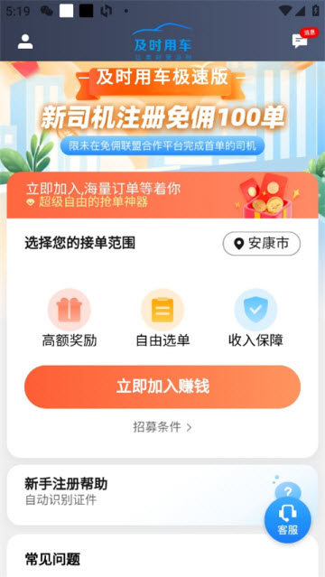 及时用车司机端app可以让车主直接入驻平台,在这里可以快速的接单赚钱,而且这里的抽成是非常少的,获得的收益还是很高的。