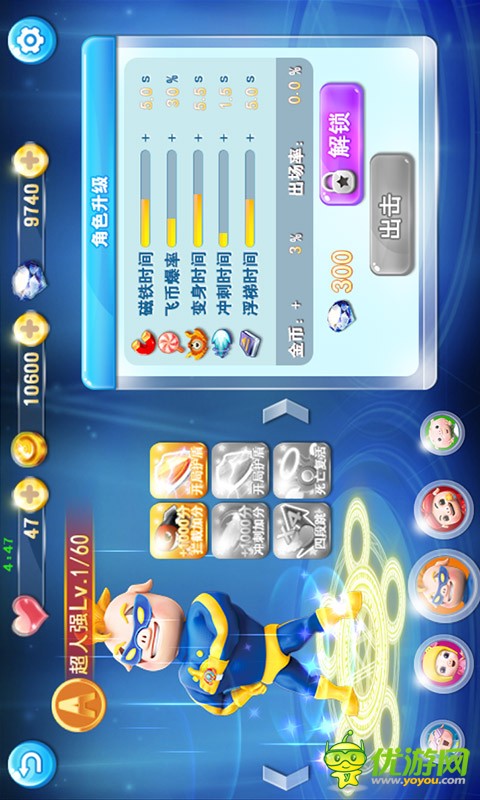 猪猪侠前进给玩家一个全新的跑酷体验,我们有5种角色,每种角色都有一种震撼的转化力!!更改后的角色将大大提高游戏性和属性值!让玩家在突破的过程中,也能享受到变身后超炫的外形!让您体验刷金币、飞怪的清爽感觉!