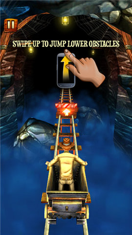 2、你乘坐着小矿车在轨道上奔跑,你能坚持多久?滑动你的手指,让小矿车跳动起来,并且收集更多的宝藏吧.