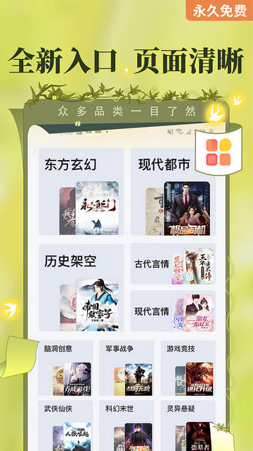 3、 网络原创、现代都市,东方玄幻,武侠仙侠,游戏竞技,现代言情、古代言情、悬疑灵异、历史军事、权威小说榜单,感受不花钱看好书的快感。