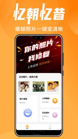 忆朝忆昔(老照片修复)app,模糊照片,一键变清晰,智能修复老照片,使用简单,帮助用户的修复老照片。AI智能修复,效果更佳,让你的老照片秒变高清。