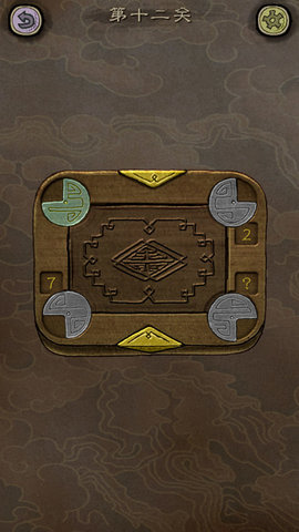 第十二关:点击转动石盘,使其缺口朝向盒子中心。①第一个石盘可以直接点击转动;②第二个石盘需要去第二关,用同样的是方法点击转动。③第三个石盘,根据数字提示,到第七关,先交换黑、白棋子位置,然后再针对棋子形状调整位置(巧妙利用中间的空缺;优先将已经对调方向的棋子移动到最右边;优先将最右边的对应形状棋子填入)。④根据规律,到第八关,倒置手机,等待一段时间,数字位置会出现石盘(因为手机是倒置的,注意转动方向!)