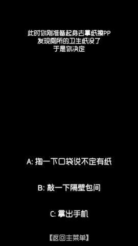 厕锁是一款画面简约的魔性文字剧情手游,游戏中玩家将前往一个厕所去蹲坑,但是蹲完发现没有卫生纸了,你会怎么办,不同的选择会推动不同的剧情发展,比如用钞票擦、直接提裤子走人等,等你选择好后出来发下你厕所们被锁了,你需要安全的逃离出去。