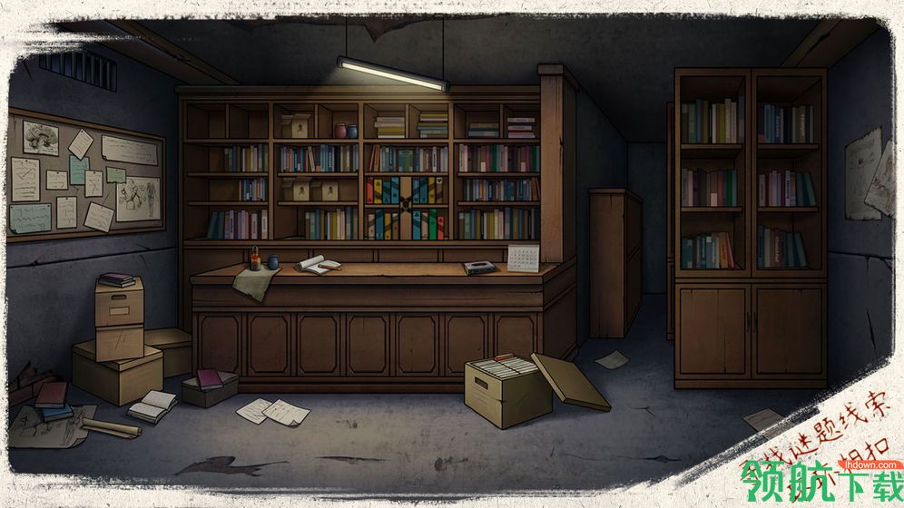 出储藏室来到走廊捡起地上的「报纸碎片」,再到尽头杂物堆里拿到「钩子」和另一块碎片。接着用钩子拿到左边画上的第三块报纸碎片,然后观察右边画上的提示(看划痕,按高度算就是2134)。最后根据提示打开抽屉拿走里面的「钥匙」,并用其打开档案室的门。