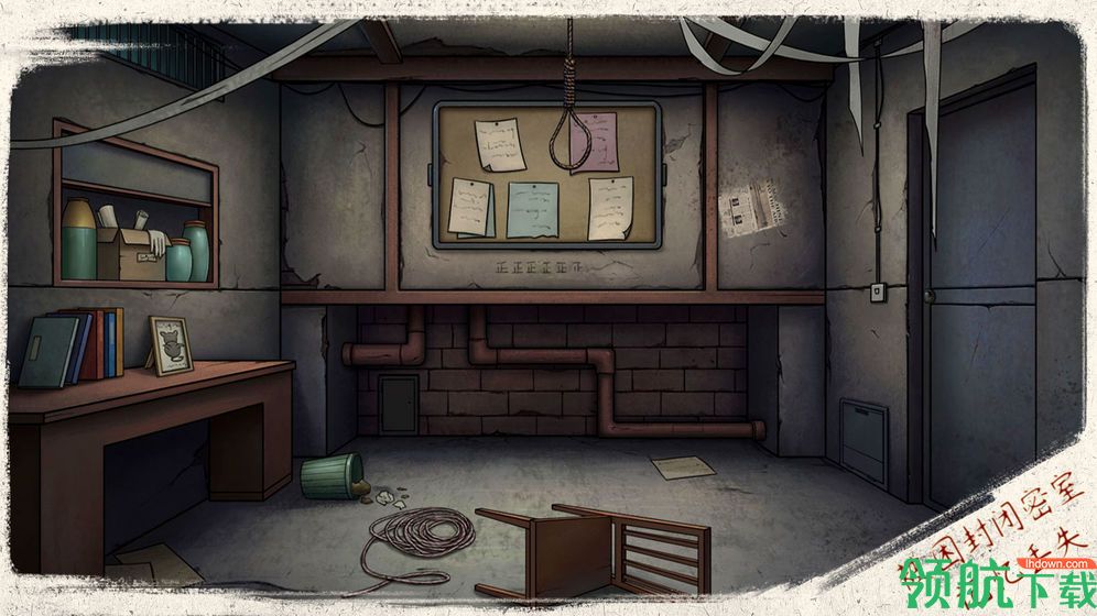 2、一号大厅:点击左边抽屜放大场景,左边的抽屉里拿走新闻文件,中间的抽屉里拿走起子,右边的抽屉里拿走卷尺,再点击右上方的吊绳,将卷尺放上去,前往二号大厅.