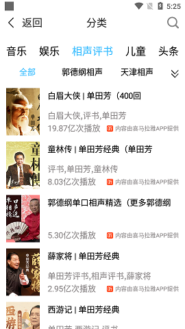 1、海量资源包括文学名著、有声小说、曲艺戏曲、著名说书等十几类海量高清音频阅读资源