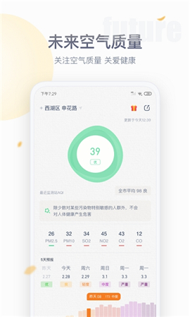 2、软件直观查阅实时空气质量和7日预报,让你知道该什么时候戴上口罩,什么时候带上雨伞。