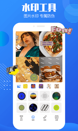 1、添加文字水印,贴纸水印,涂鸦水印,全屏铺满水印,多种水印模式自由选择,灵活方便。