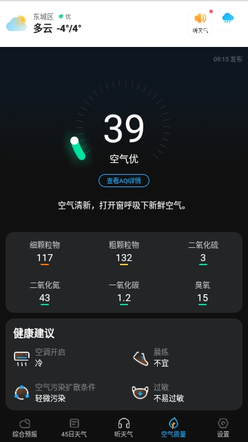 3、实时监测:空气质量,PM2.5等6项空气质量指数实时看,24小时天气情况逐时看。