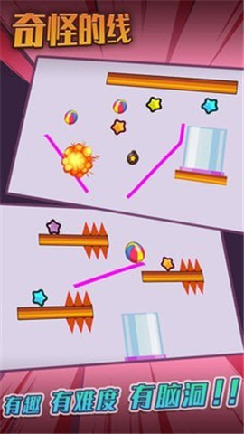 在小球运动的过程中,让小球获得散落在各处的星星,从而解锁更多的关卡。 一共有高难度烧脑的六十个关卡等待你的挑战。画出一条条线,成为小球的行进的轨道,让小球通过重力和你画出的轨道线,顺利进入到玻璃筒中,从而过关。物理高手们,燃烧你们的脑细胞,来挑战重重关卡吧!