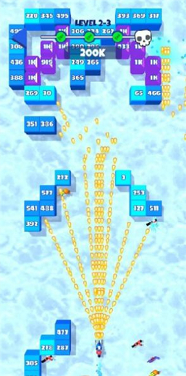 雪地摩托射击,摩托车上装置了射击装备,可以射出简单的子弹效果,你的人物就是清理那些在雪地上冒出的冰块,放置其他人被撞倒,每个冰块上面都写着数字,这些数字代表着多少枪才可以将它们击碎,有些冰块中藏匿着更好的武器装备,当你打碎冰块闯过去后,会为你的射击装置升级,射出更好看的弹幕。