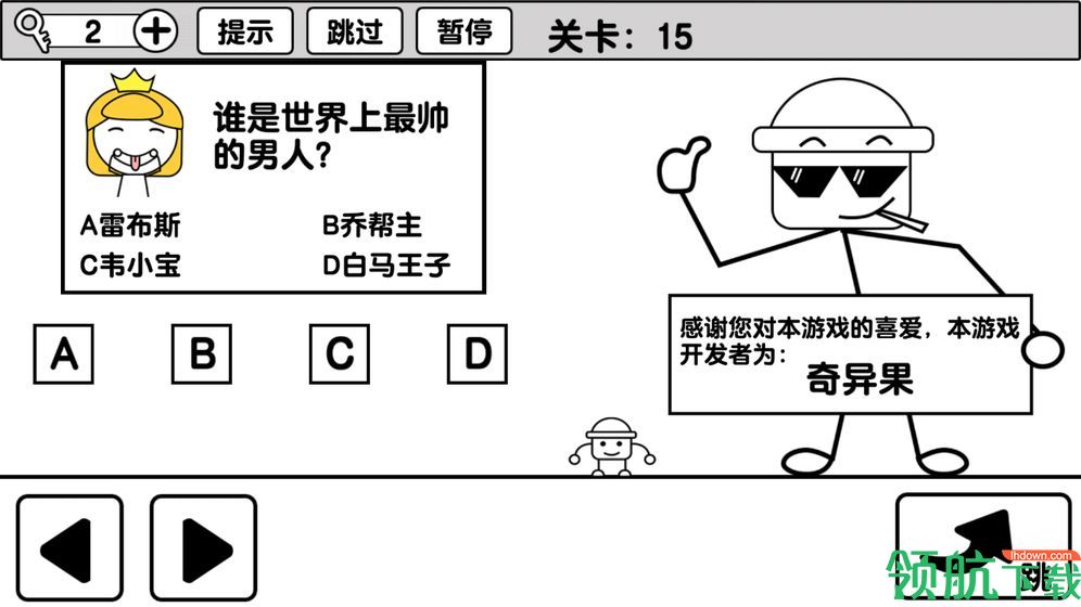 《冒险大师游戏》是一款以救公主为题材的闯关游戏,这一款原版好像在app上有,鸡仔忘记叫什么名字了,也是这种闯关专门坑你的,但是这款的话前面不敢设置得那么坑,要不然一开始把你坑跑了谁负责啊,游戏玩法很简单,左右和跳三个键,控制小角色抵达终点,救到公主即可获胜。但是一切都没有你想得那么简单,第一眼看似关卡那么简单,其实暗藏杀机,要么突然被草里的陷阱刺死,要么突然掉进黑洞,还有被广告牌砸死的,怎么玩个游戏都这么难呀。