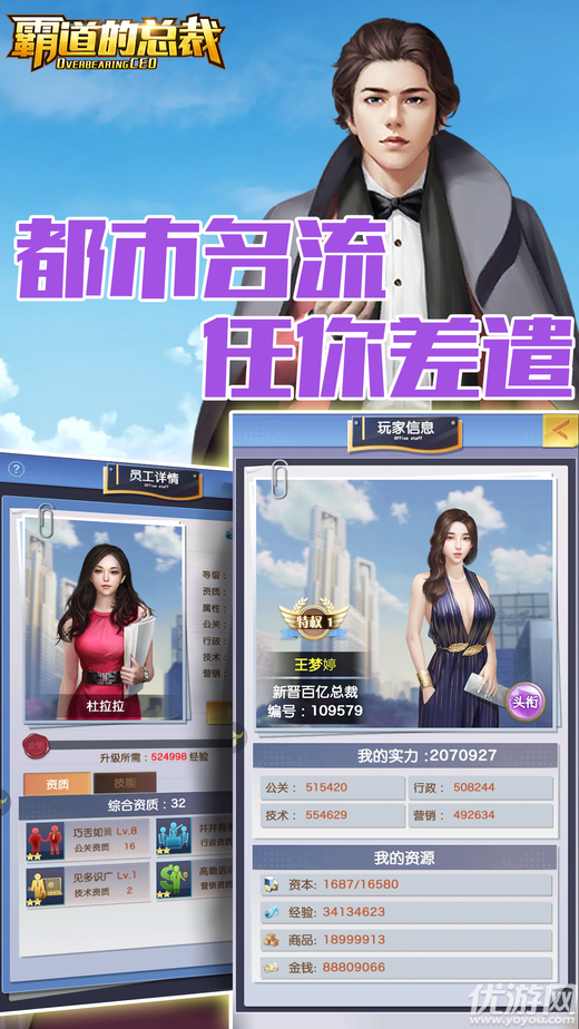 霸道的总裁是一款商战类型的模拟经营手游,游戏中玩家将化身风头正劲的霸道总裁,在商场上挥斥方遒,在资本的世界中纵横,还可以邂逅千娇百媚的小仙女,私密约会,甚至生儿育女,进行集团联姻。