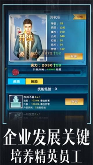 挑战关卡,商业谈判,收购各公司,让各金融巨头每天向你汇报工作和业绩。随着公司规模提升,自动解锁招纳更多的优秀人才前来效力。