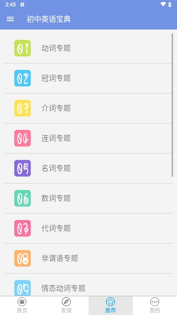1、发现:初中语法、初中词汇、初中口语、初中听力、学习方法、英语阅读、课外阅读、试题荟集等八大类别,分门别类逐个讲解,让你系统的全面掌握初中英语知识;