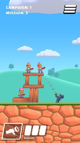 在游戏中,玩家是火箭筒战士。你必须拿起手中的武器向对手射击。这个游戏和《愤怒的小鸟》非常相似。你可以点击屏幕射击对手。有不同的层次等待你去挑战。玩家可以瞄准你的对手,通过射击辅助线射击。