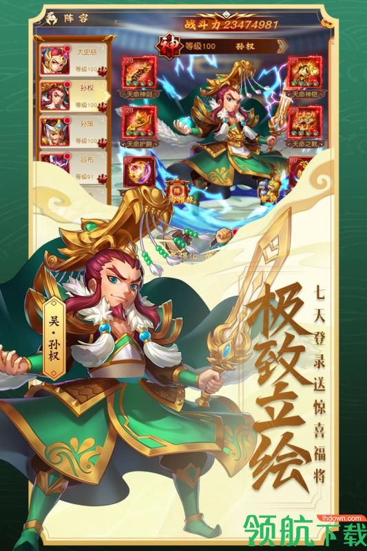 游戏中拥有完整的三国时期的名将,而且玩家可以自由的进行不同武将间的搭配,选择合适的阵容进行搭配战斗,可以发挥武将的最强战斗力,每个名将都有独创的技能,以及将门之间的羁绊,让你这的三国大战拥有无敌的激战感。