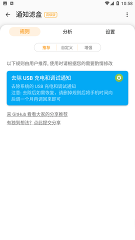 添加任意自定义规则以过滤,支持按 App 黑白名单,文本关键字匹配,正则等。过滤可选对通知消除或静音。