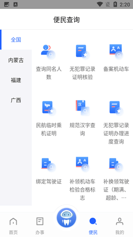 推出查询同名人数、查询规范汉字、开具民航乘机临时身份证明、查询网站备案、绑定机动车等多项特色应用,方便群众随时随地办理常用高频事项。
