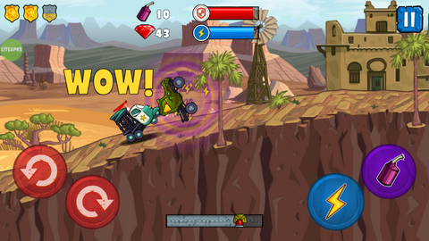 一款非常有趣的横版赛车闯关游戏,游戏中的玩法十分新奇,玩家需要驾驶你的赛车在充满障碍的道路上前行,吃掉阻挡你前行路线的赛车,增加你的赛车战斗力,同时需要注意远离警察