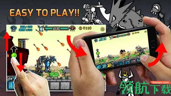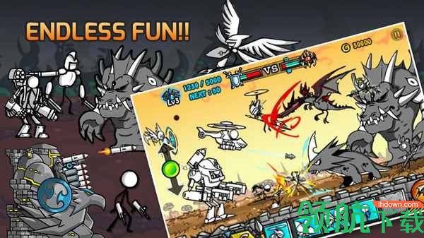 卡通族一直被恶魔族奴役着,终于有一天卡通族为了自由开始了反抗,卡通大战爆发了!在这个游戏中,在漫画世界中,生存着两个种族:恶魔族和卡通族,它们世代为敌,你的目标是控制卡通族大军摧毁恶魔族的城堡,不断的制造士兵们发起冲击,还可以控制城堡上的箭塔来消灭来犯的敌人,随着战争的升级,你将控制越来越多更强大的卡通族战士。来吧,带领卡通族取得自由之战的胜利吧!画风非常独特的战斗手游,游戏中的很多角色都是像火柴人一样的线条涂鸦风格,当然也有立绘比较精美的怪物武器,这两种风格的混搭,形成本游戏的乱斗场面,非常之精彩!