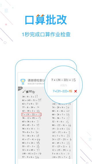 1、作业检查:手机拍摄小学作业,一秒完成检查。