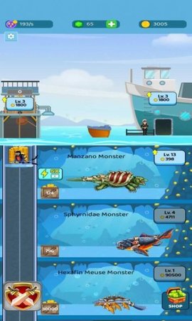2、在探索和战斗的过程中。玩家可以去收集到很多的金币,利用这些金币,你可以自由购买想要的强大的海洋生物