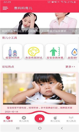 惠妈妈育儿app:专为广大家庭打造的线上育儿专家,涵盖了孩子的各个阶段,从怀孕到生产都有非常详细的划分,不管你有什么样的问题都可以通过这个平台来提问,会有专家在线为你解答,育儿更加的简单,而且还可以让你实时记录孩子成长的每一个阶段。