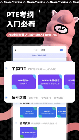 PTE羊驼是一款专业的英语练习app,PTE英语学习掌上备考必备,超过120万+移民留学用户的选择。羊驼PTE集合AI口语测评、周更新机经库、全真20题型练习打卡、分享互动社区于一体,紧跟PTE考场动向,备考趋势与机经新题实时更新,适用PTE、雅思与托福考生英语口语阅读基础练习。欢迎下载体验。