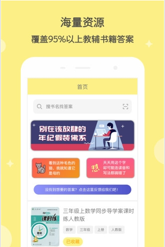 答案搜app是一款专为中小学生打造的答案搜索软件,支持中小学学作业答案查询,包含了各年级各科目(小学一年级至高中三年级语文,数学,英语,物理,化学,地理,历史,政治,生物)的教辅答案,课后答案以及学习资料,涵盖95%以上教辅书籍,一键扫码搜索,秒出整本答案,同时支持书名搜索,按年级,按学科等筛选搜索。应用内还提供多语言翻译以及计算器功能,是中小学生必备的学习工具。