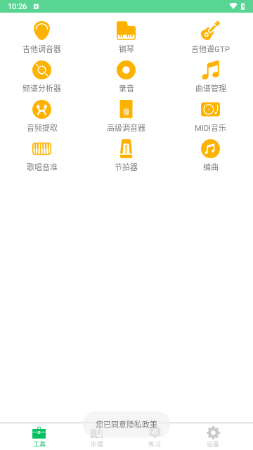 在工具页面可以看到各种音乐工具,比如高级调音器、键盘合成器、音频提取、吉他谱、钢琴等等