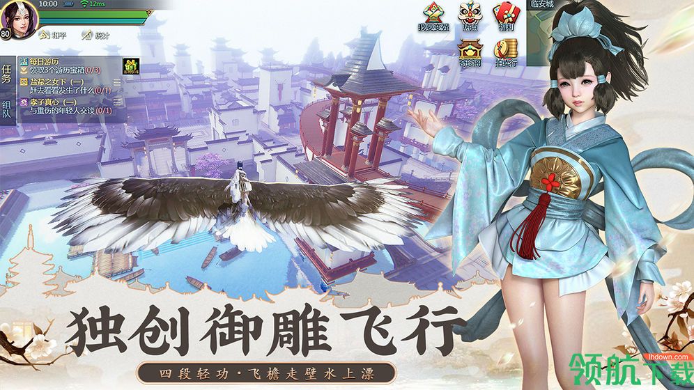 1、没有轻功,就没有武功。用四段轻功,真正体会飞檐走壁、浮于水面、翱翔空中的轻功。创新设计,御鹰可以飞翔,鹰可以在空中变换,无缝领略江湖美景