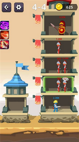 游戏玩法: 左边的蓝色城堡是我方阵营,右边的红色城堡代表的是敌方阵营,每一关卡分为四个小关卡,逐个通过每个小关卡才算挑战成功哦。 骑士和敌人头上的数字即当前的血量,点击我方骑士,移动到对应的敌人面前,即可战斗,只有血量大的才能在战斗中获胜哦。 技能在小关卡里是逐渐积累的,选择合适的技能可以让你的获胜几率更大哟~