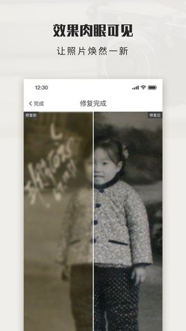 拾光图使用人工智能AI技术,可以一键修复模糊、破损的老照片,并对照片中褪色的部分进行自动补色。使珍贵的老照片得以焕发光彩,永久保存。