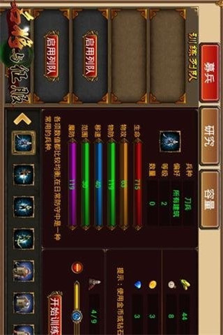 座驾培养:将领的座驾培养需要从闯关中获取不同的道具进行培养,主要目的是培养将领的基础攻,防,血,不同的部位和星级需要不同的道具哦,但是堂主一向记性很坏,不过这个游戏配备了强大的指引功能,只需要按照指引,刷就行了。