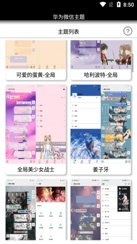 《微信主题 2.0版》一款实用的主题美化app,微信主题软件包含了大量微信主题资源,各类主题、卡通、明星、山水、动物等,绝对能满足您的需求,操作简单,一键即可轻松更改微信主题,那还等什么