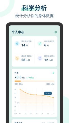 辟谷计时器APP可以记录每天体重与轻断食数据统计,帮助您养成健康习惯,同时使你更健康、更有活力,通过自定义断食计划,提醒您何时进食,并提供有助于您理解身体状态的信息,即可助您提高头脑清晰度,并降低患病风险。
