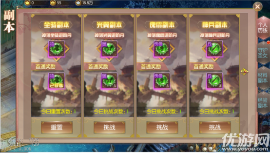 进阶副本,在《昆吾》中扮演着非常重要的角色!想要升级坐骑、光翼、傀儡和神兵,那就必须得到进阶副本中闯荡一翻了;在这里,你能获得各种进阶的材料,让你战力更上一层楼!角色等级到达30级开启主线副本,每个关卡有挑战次数限制,挑战次数每日定时更新;玩家VIP达到一定等级或达到一定等级后,可扫荡已通关副本。扫荡有扫荡CD时间,需等到CD时间才获得奖励。进入主线副本后,在限定时间内击败所有敌人即可胜利;挑战成功后发放奖励,将依据通关副本时间进行评分。玩家每日可挑战进阶副本,每个关卡有挑战次数限制,挑战次数每日定时更新。首次挑战可获得首通奖励以及副本掉落奖励。