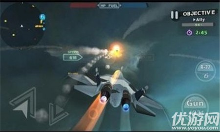 与一般的空战射击游戏玩法相类似,选择出战的战机,凭借你犀利的操控,根据左上角的雷达抵达相应的阵地,用导弹武器击敌对的战机。