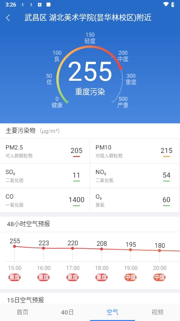 2、今天空气质量的6大污染物情况和浓度,包括:PM2.5细颗粒物、PM10粗颗粒物、SO2二氧化碳、NO2二氧化氮、CO一氧化碳、O3臭氧;