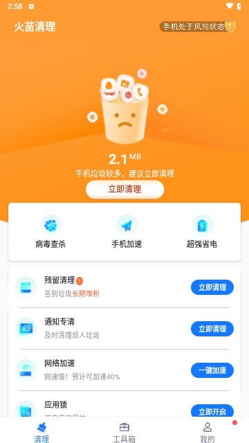 火苗清理是一款易于使用的清除内存软件。它可以用来快速清理手机垃圾。使用和操作都非常方便。它可以提高手机的使用效率。有需要的朋友可以下载。