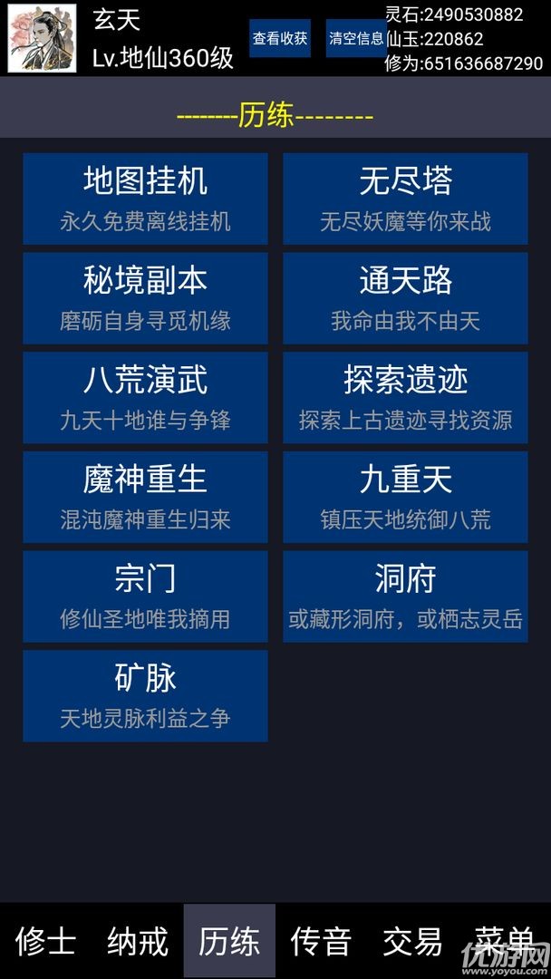 放置类修仙文字游戏,全新玩法,全新感官,欢迎前来来游玩!与众多仙友们来追寻永生的道路吧!