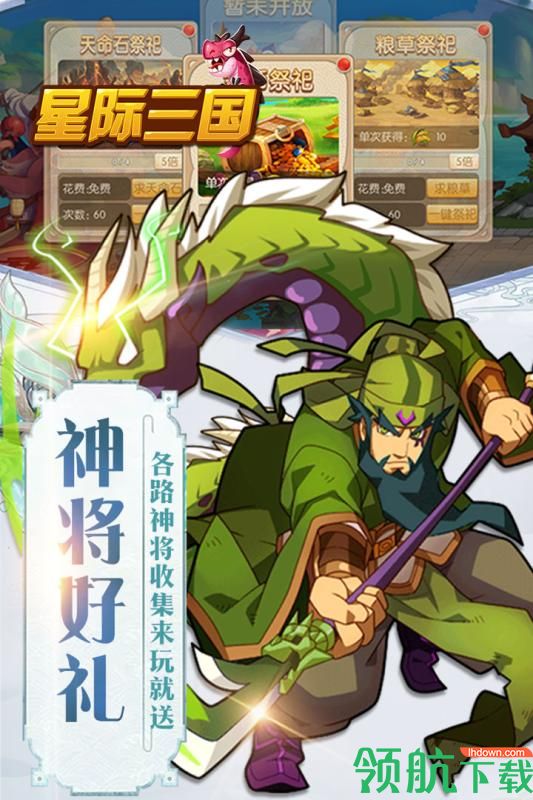 《星际三国》是款卡牌收集类游戏,游戏美术风格q萌。星际掉落10枚陨石,化作力量无穷的神兽玉玺,掉落各个州郡,谁能收集齐这10枚玉玺便能获得无上神力,主宰三国。游戏将瑞兽元素融入到三国题材中,加上颠覆性无节操剧情,给玩家带来与众不同的体验。游戏中独创骑战玩法进一步加大了战场的不确定性。众多著名武一一登场,更融入大量瑞兽元素,让每个武将都能骑乘驯服的瑞兽一同作战,让玩家在瑞兽的帮助下体验微型战争的乐趣。国战,军团战,跨服个人战,你想要的pk都在里面,应有尽有,来开启属于你的王朝吧