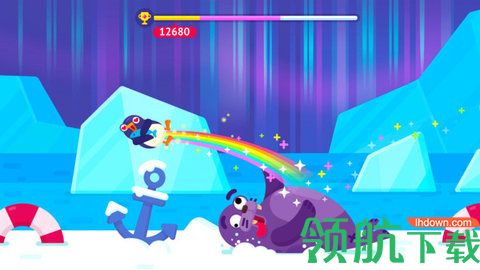 2、简单的操作玩法,通过点击屏幕,让企鹅降落在各种动物身上,不断反弹飞行冲刺;