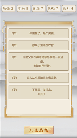 您可以享受道家玩法、文字游戏,选择自己的天赋,用文字表现呈现各个年龄段的人生体验。
