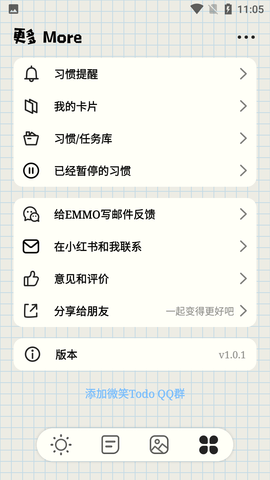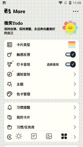 微笑todo:用户在这里打卡会非常简单,他们只需要提前计划好每天的活动,然后向右滑动或轻轻按下习惯。叮的一声,你的打卡完成了,还可以摇一摇切换不同的打卡风格;当然,你也可以长按并添加一个打卡日志,这样当你回顾自己的计划时,会更加直观。同时,当你每天完成60%以上的习惯,就可以获得一张精美的卡片。你可以点击它,在它的背面写下你对生活的感受,你也可以保存你的微笑或分享给你的朋友。那我们一起加油吧,用微笑来换取幸福生活的努力和自律。欢迎有需要的用户下载体验!