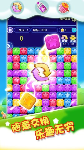 消除内部相同的星星,这样会有更多有趣的图案。每个关卡都有一个目标来完成。